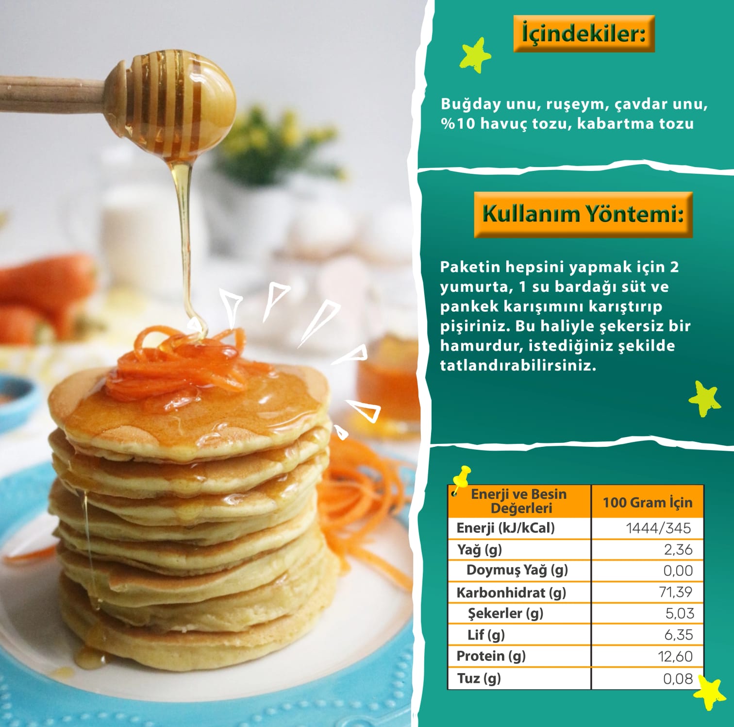 Pankek güzel ve hızlı bir kahvaltı alternatifi olduğu kadar 5 çaylarında arasına mor çilokata ya da bal vb sürülerek de ikram edilmekte. Ruşeym ve çavdar unu eklememiz ile karbonhidrat kalitesini arttırdığımız karışımımızı bir adım daha ileri götürebilmek için havuç da ekledik. Biz havucu düşük sıcaklıklarda kurutabildiğimiz ve besin değerleri azalmadan size ulaştırabildiğimiz için her bir paketimizin içinde 1 çok büyük havuca (78 gram) denk havuç var diyebiliyoruz göğsümüzü gere gere. Pankek şekersiz olduğundan şeker ya da meyve özleri tatlandırabilirsiniz. Umarız siz de en az bizim kadar beğenirsiniz.