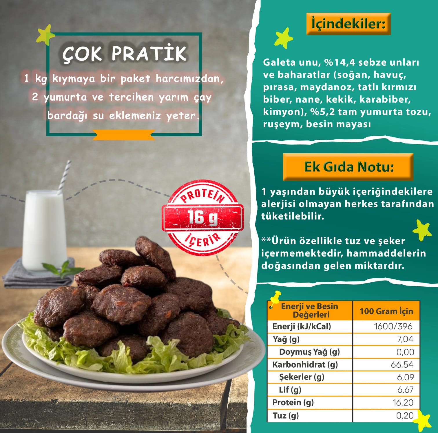 Yoğun bir gün sonunda bitkin ve ne yemek yapacağım derdi ile eve dönerken kasaptan alacağınız kıymaya katarak gönül rahatlığı ile atıp karıştırabileceğiniz, soğandı ekmekti sizi uğraştırmayacak bir köfte harcı yaptık. Kesinlikle ve kesinlikle katkı maddesinin hiçbir çeşidini içermiyor. Kesinlikle ve kesinlikle gıda güvenliği ve kalite açısından en iyi baharatlar kullandık. İçindeki ekmeği ekşi mayalı tam buğday ekmeğini fırından alarak kendimiz kurutup öğütüyoruz. Besin değeri artsın diye ekstra protein, sebze ve ruşeym ekledik. Protein artışını da de öyle kimyasal ilaç formunda değil yumurta ile besin mayası ile sağladık. Baharatları da dengede tutup tuz eklemedik. Acı koymadık. Hedefimiz çocukların severek tüketeceği köfteler yaratacak sivri tatları olmayan bir harç yapmaktı. Soğanının yanı sıra biraz pırasa ve havuç ekledik, maydanozu da bol kattık.