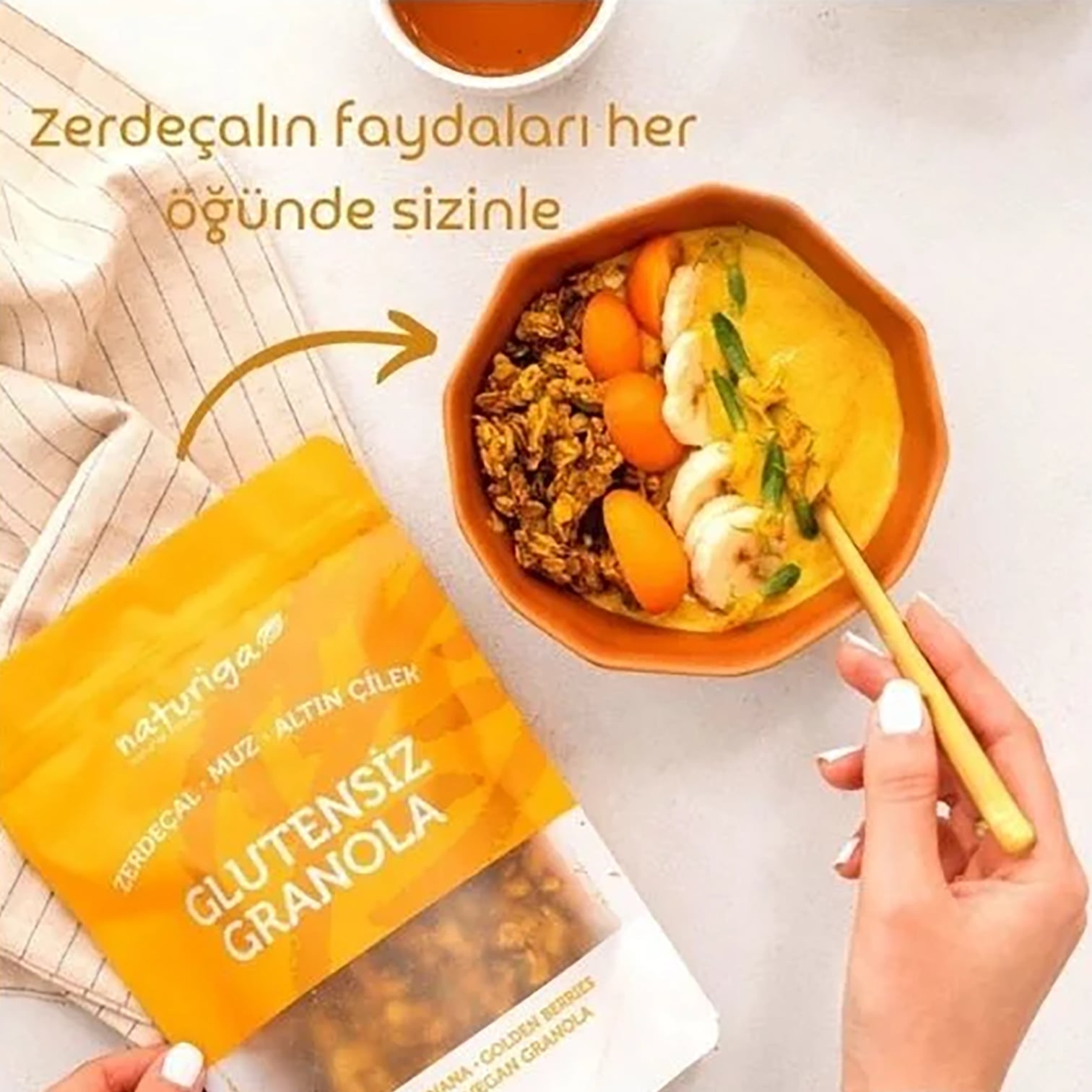Güne'Altın' yoldan başlamanın en güzel yolu Zerdeçal & Altın Çilek& Muz granola...