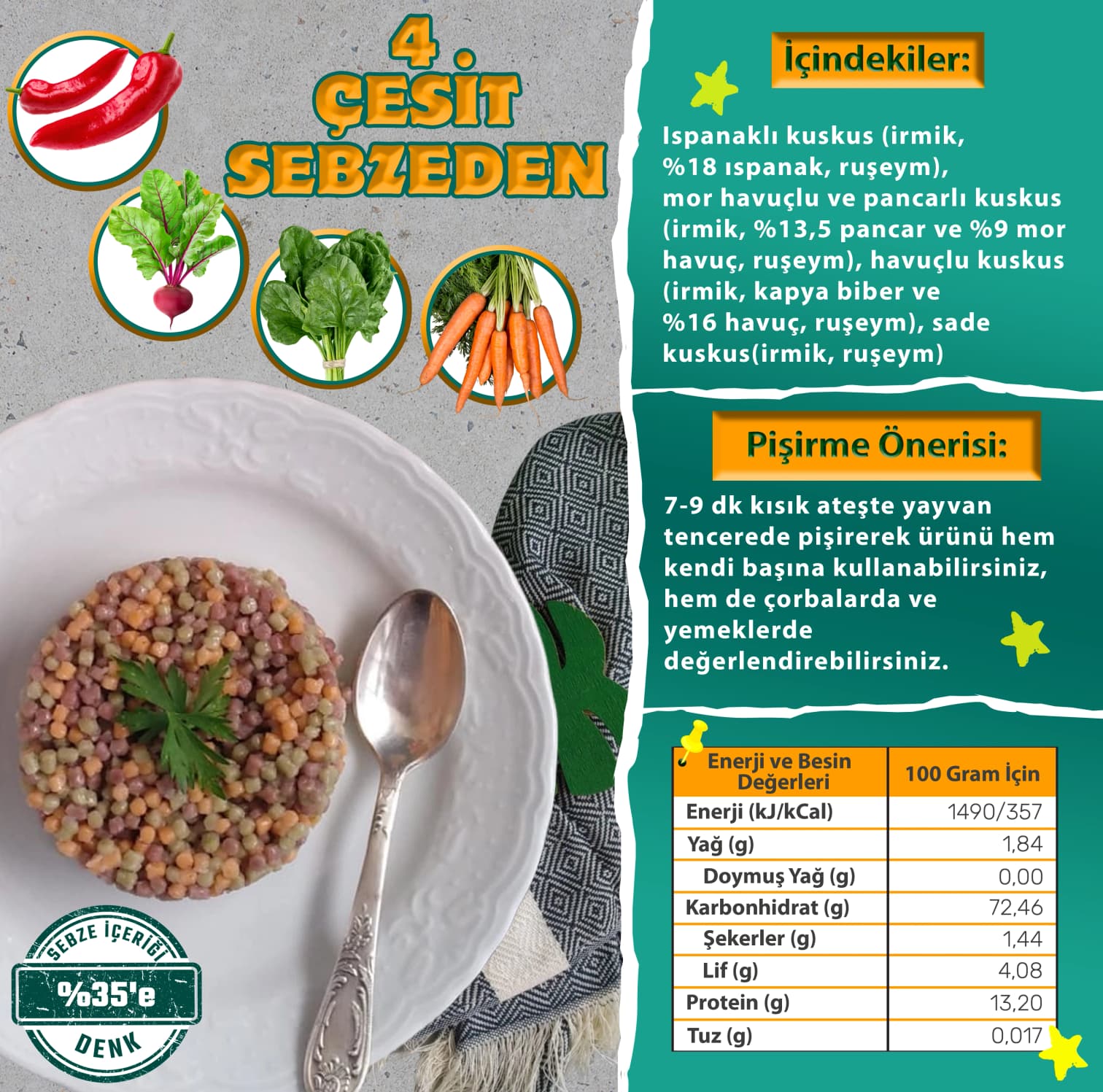 Hem sebze içeren hem de tertemiz üretilen Türkiye'nin ilk sebzeli kuskusunda tabi ki boya vb bulunmuyor. Hatta renk koruyucu ve renk sabitleyici katkı maddeleri kullanılmadığı ve sadece sebzelerin kendisi bulunduğu için pişirme aşamasında ve sonrasında renk kaybı yaşanabilir. Sakın panik yapmayın:) Sebze kaybı yaşamamak adına pilav gibi yapmayı yani suyunu çektirerek pişirmeyi tavsiye ederiz. Çorbalarda da kullanabilirsiniz tabi ki. Afiyetler olsun...